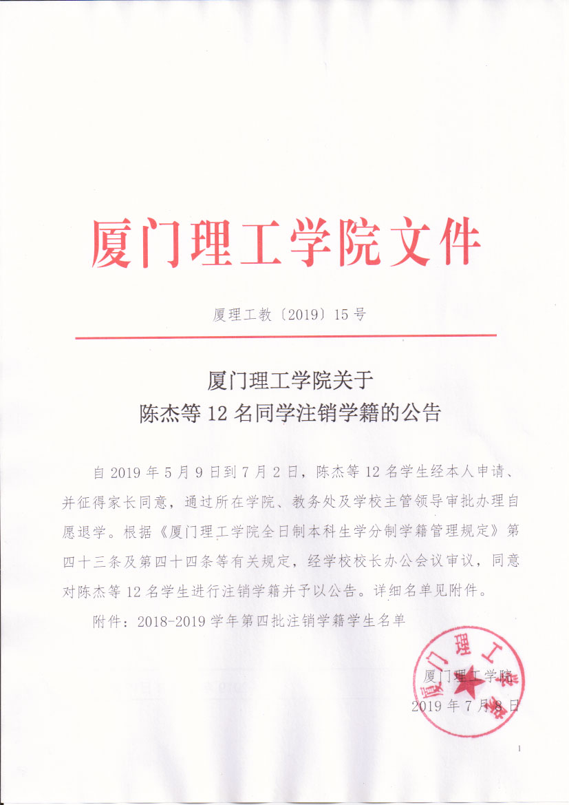 厦门理工学院关于陈杰等12名同学注销学籍的公告
