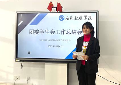 最后,团委书记李偲老师对本次大会进行了总结,肯定了团学本学年的工作成果并分析了团学工作目前存在的问题。并结合实际对团学志愿者们在坚定理想信念,胸怀大局意识,发挥模范作用三方面的必备素质作出期许。同时,李偲老师表示期末临近,希望大家合理安排时间,认真备考,也希望大家在来年的学习与工作中取得更好的成绩,积极为学院学生工作贡献自己的力量!